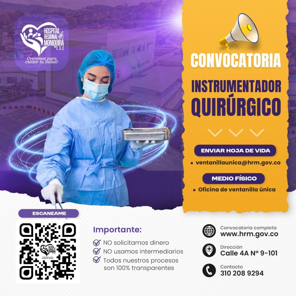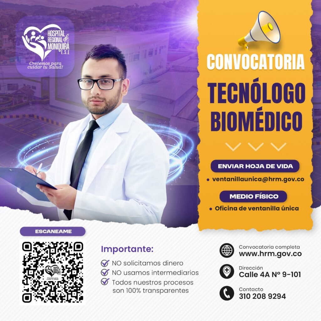 REQUERIMOS TECNÓLOGO BIOMÉDICO(A) La empresa de servicios temporales requiere contratar DOS perfiles con FORMACIÓN EN TECNOLOGÍA BIOMÉDICA para prestar servicios en misión labor contratada en el Hospital Regional de Moniquirá E.S.E. El criterio de ingreso para el proponente seleccionado podrá contener factores de evaluación tales como pruebas psicotécnicas, pruebas de conocimiento, test psicométricos o de personalidad, que garanticen la idoneidad del profesional que ingresa, así como las capacidades para el trabajo en equipo e idoneidad laboral. Este plan de selección deberá ser practicado al ingreso y luego será utilizado como mecanismo de evaluación durante el periodo de trabajo del personal (periodo de prueba), con una periodicidad que será evaluada en este estándar de evaluación. Al participar en la convocatoria se autoriza el uso de los estándares enunciados. Requisitos: Competencias Técnicas Contrato con Empresa Temporal: Salario Básico Mensual: $2.500.000 + Prestaciones Sociales y Cesantías. Competencias Comportamentales: Proceso de Selección: Los interesados deben allegar hoja de vida en formato FUNCIÓN PÚBLICA completa (soportes actualizados) a la calle 4A # 9–101 (Portería Principal) barrio Ricaurte (Moniquirá) Oficina Ventanilla Única indicando el cargo al cual aspira, o a la dirección electrónica ventanillaunica@hrm.gov.co indicando la vacante en el asunto del correo. El Hospital Regional de Moniquirá no exige aporte económico para realizar procesos de selección. NO APLIQUE SI NO CUMPLE CON TODOS LOS REQUISITOS.